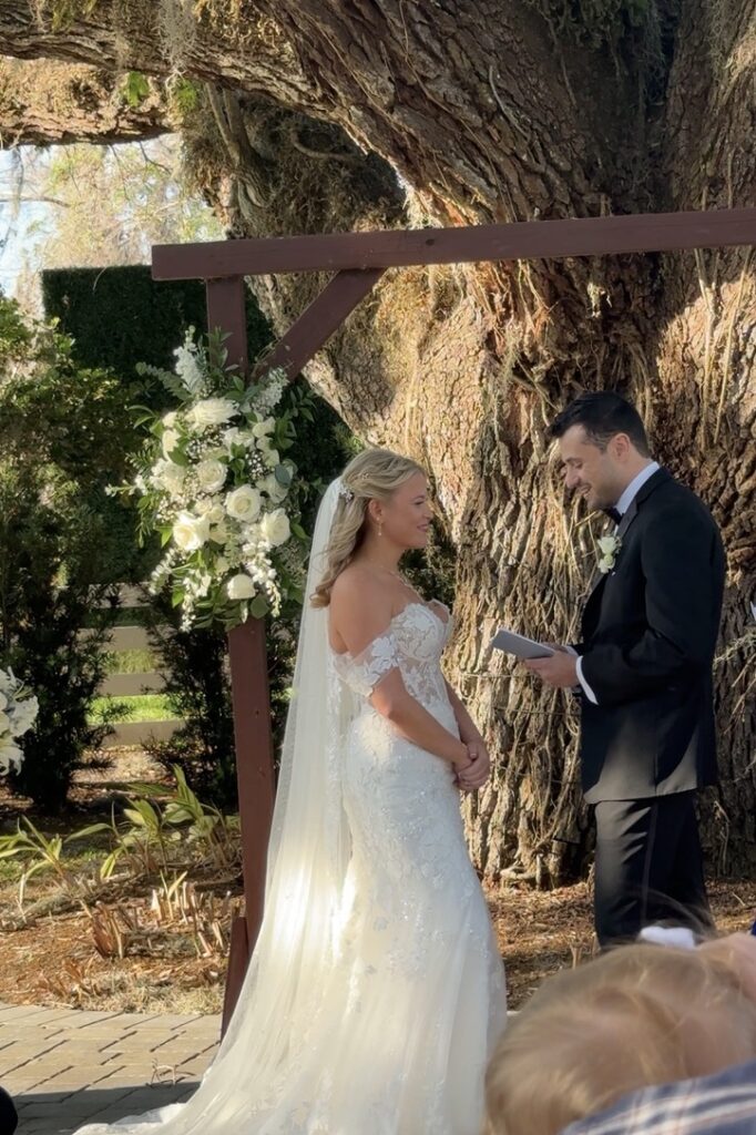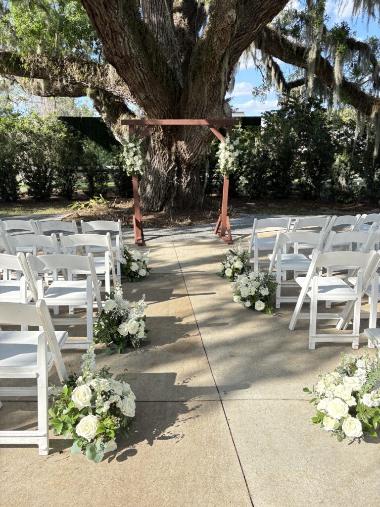 The ceremony took place beneath one of the property’s large oak trees, with Spanish moss overhead and natural light filtering through. The setup was intentionally simple with a wooden arbor and low floral arrangements lining the aisle. Keeping everything close to the ground made the space feel open and let the tree and surroundings do most of the work. White roses, lilies, and greenery were used throughout, with small touches of blue woven in.