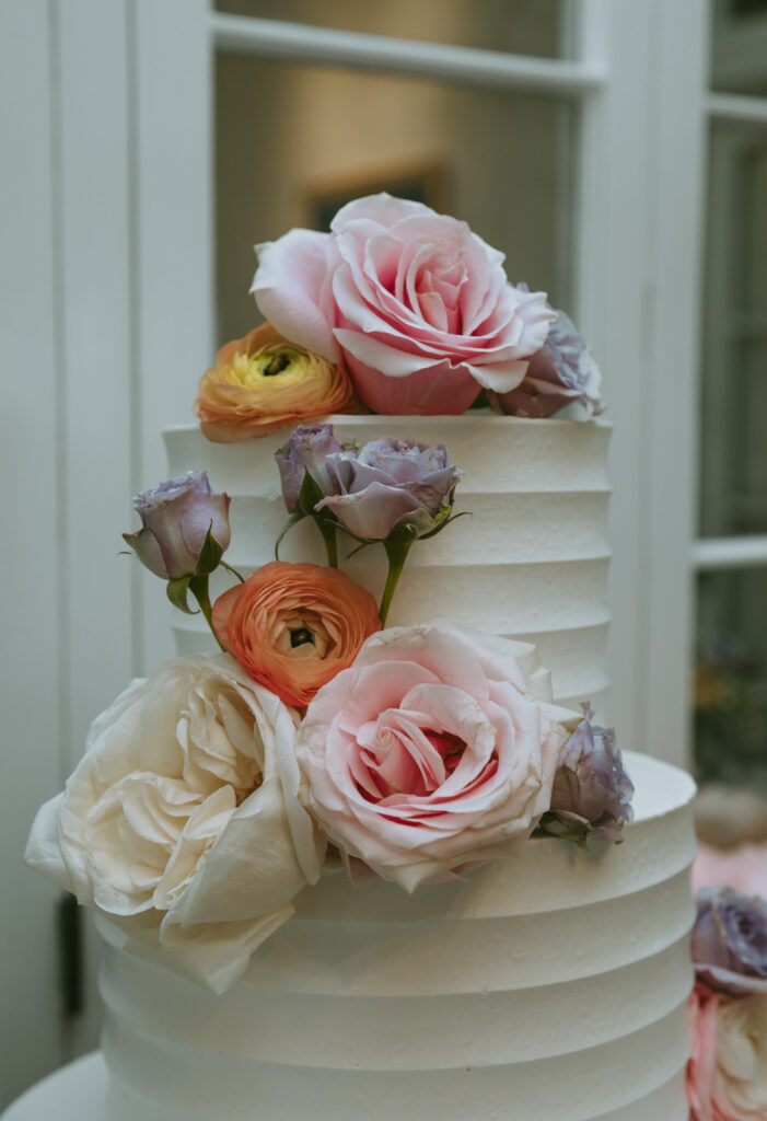 Florals were styled organically, favoring movement and softness over formality. Garden roses, ranunculus, and delicate filler blooms were arranged in loose compositions across the estate, complementing the venue’s classical interiors and lush outdoor setting. Textural details—lace, linen, glass, woven chargers, and subtle gold and silver accents—added depth while maintaining a light, airy feel.